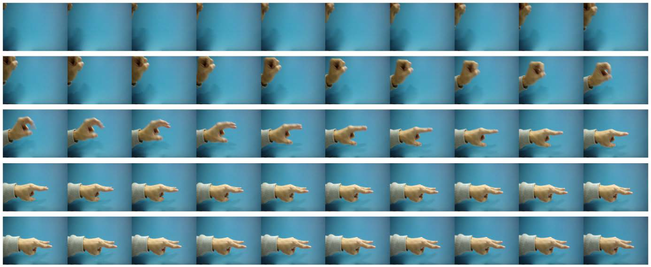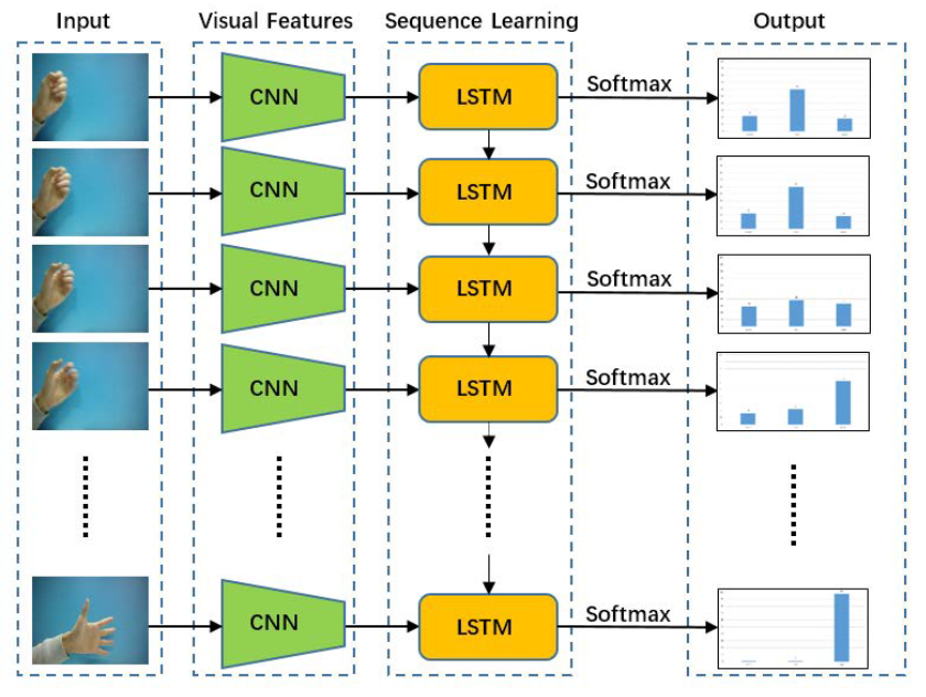 在本文中,我们提出了一种基于视觉的人机交互手势识别系统。手势识别系统用于开发人类和我们的机械手之间的实时石头剪刀布游戏。我们的任务是通过使用高速摄像机尽快预测手势。由于计算复杂度,标准的基于长期循环卷积网络的动作分类系统无法满足于基于高速相机的分类任务。我们建议通过采用更高效的网络架构并使用基于阈值的方法来提前预测手势来解决这个问题。我们在石头剪刀布游戏的新手势数据集上验证了我们提出的方法。该模型能够成功学习持续时间和复杂程度不同的手势。对 CNN 和长期递归卷积网络进行了比较分析。我们报告的手势分类准确率为 97%,并且报告了每帧 7 毫秒的近乎实时的计算复杂性。