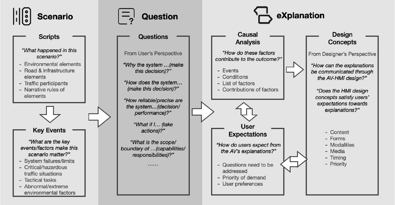受益于可解释人工智能 (XAI) 领域的进步,解释在自动驾驶汽车 (AV) 环境中越来越具有前瞻性。事实证明,提供解释对于人机交互至关重要,但解释什么以及如何解释仍有待解决。本研究旨在通过结合用户和研究人员的观点,在 XAI 和人机交互领域之间架起桥梁。在本文中,提出了一个解释模型的概念框架,以指示在 Human-AV 交互中需要解释哪些方面。基于该框架,我们引入了一种基于场景和问题驱动的方法,即 SQX-canvas,以指导在某个 AV 场景中根据用户需求生成解释的工作流程。为了对该方法进行初步验证,我们举办了一次涉及研究人员和用户的共同设计研讨会,以视频剪辑的形式提供了四个 AV 场景。参与者按照 “情景、问题和解释” 过程提出了解释概念并表达了他们对 AV 场景的态度。很明显,用户对解释的需求因场景而异,并讨论了发现和局限性。这种方法可以为促进透明的人机交互的研究和实践提供启示。