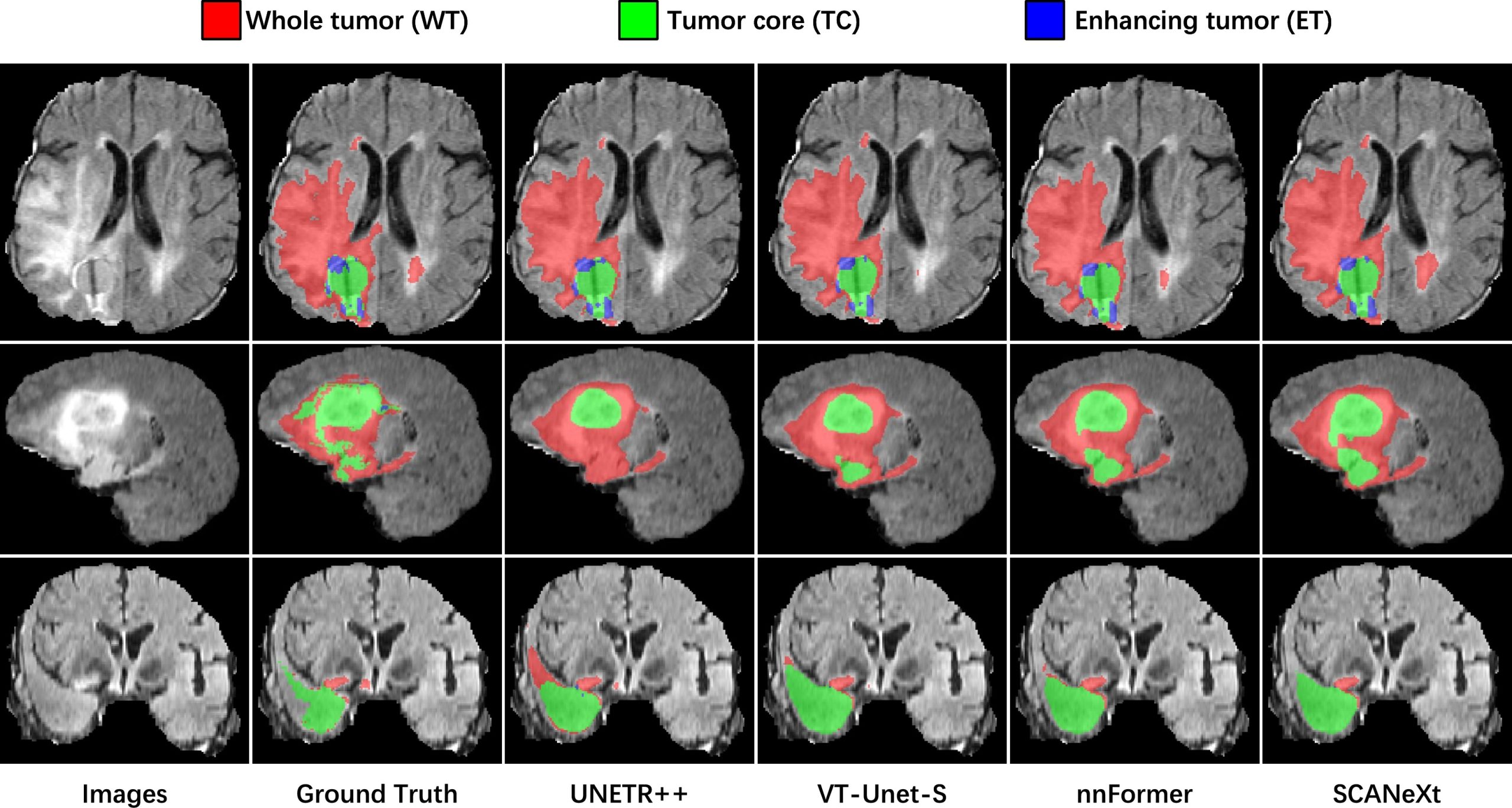 现有的 3D 医学图像分割方法通常可分为基于卷积或基于 Transformer 的方法。虽然卷积神经网络 (CNN) 在提取局部特征方面表现出色,但它们在捕捉全局表征方面遇到了挑战。相比之下,视觉 Transformer 中存在的连续自注意模块擅长捕捉长距离依赖关系并实现扩大的感受野。在本文中,我们提出了一种用于 3D 医学图像分割的新方法,称为SCANeXt 。我们的方法结合了双重注意(空间和通道注意)和 Conv NeXt的优势,以增强 3D 医学图像的表征学习。具体而言,我们提出了一种新颖的自注意机制,旨在涵盖整个特征维度的空间和通道关系。为了进一步提取多尺度特征,我们在双重注意块之后引入了一个受 ConvNeXt 启发的深度卷积块。在 Synapse、BraTS 和 ACDC 三个基准数据集上进行的大量评估证明了我们提出的方法在准确性方面的有效性。我们的 SCANeXt 模型在 ACDC 数据集上取得了最先进的结果,骰子相似度得分为 95.18%,远远优于当前方法。